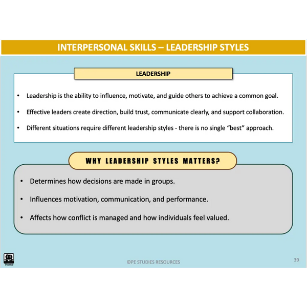 This 174-slide PowerPoint is tailored for the Year 12 WACE General Health Studies course, fully aligned with the 2025 SCSA syllabus. Bringing together Interpersonal Skills, Self-Management Skills, and Principles, Frameworks and Models, the resource provides a detailed exploration of leadership styles, emotional intelligence, and community development principles that underpin effective health promotion.